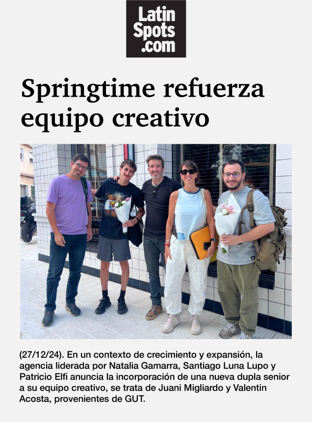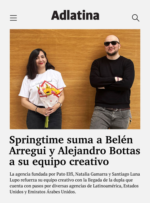 Springtime is an independent, creative, and small agency that works on large-scale projects across regional and global markets for a range of brands. We operate on a project basis, with a flexible senior team located in different cities, scaling up or down depending on each business challenge. While we work remotely, the three founding partners are based in Buenos Aires and remain deeply involved at every stage to ensure creative excellence.
